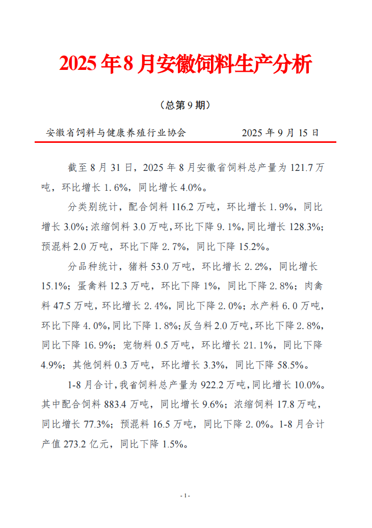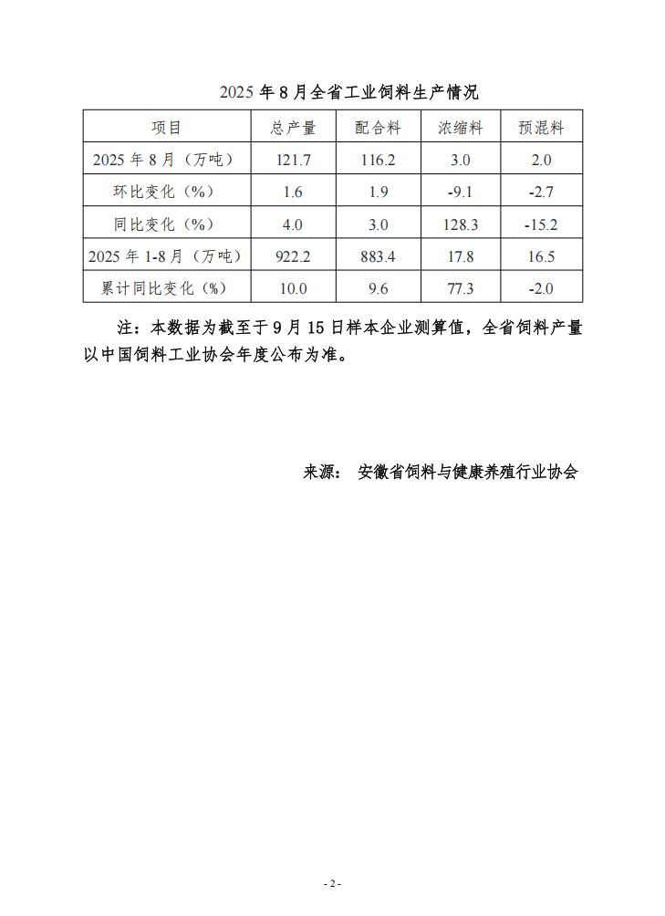 2025年8月安徽饲料生产分析